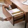 Hai ngăn kéo nhỏ được bố trí khéo léo dưới mặt bàn giúp lưu trữ gọn gàng các vật dụng như sách, tạp chí, điều khiển TV hay phụ kiện nhỏ – giữ cho không gian luôn ngăn nắp, tinh tươm.