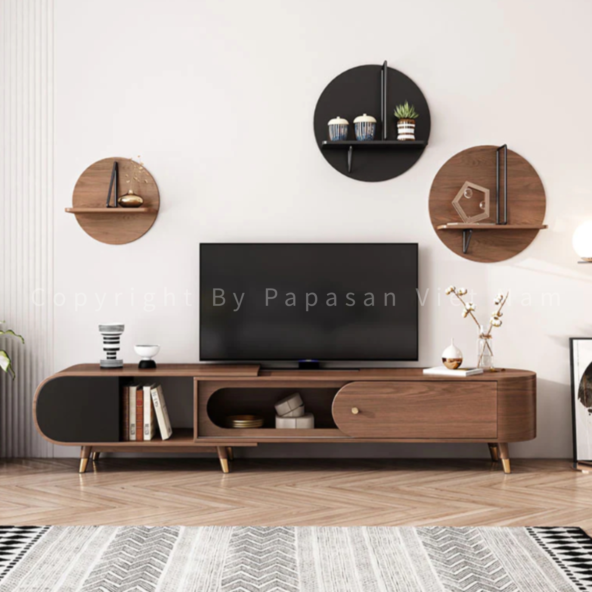 - Chân kệ chắc chắn: Thiết kế vững chãi, tạo cảm giác thông thoáng, dễ dàng kết hợp với sofa và bàn trà.