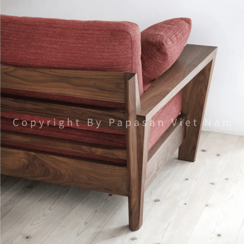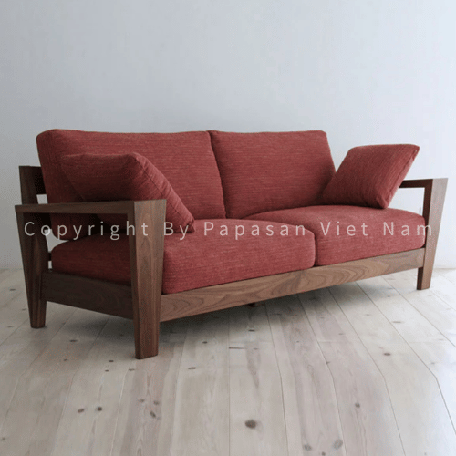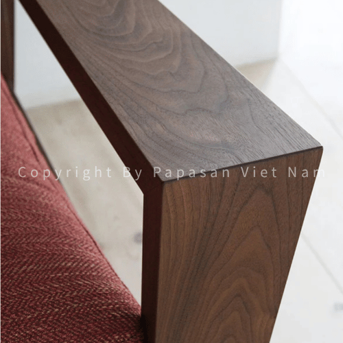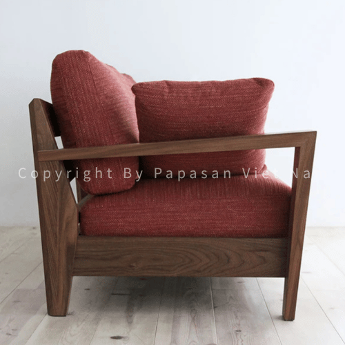 Khung ghế được làm từ gỗ sồi tự nhiên cao cấp, phủ sơn nâu ấm trầm – màu sắc đặc trưng của những món nội thất gỗ xưa. Kết hợp cùng đệm nỉ màu đỏ rượu vang nổi bật, tạo nên điểm nhấn tinh tế và ấm áp cho không gian phòng khách.