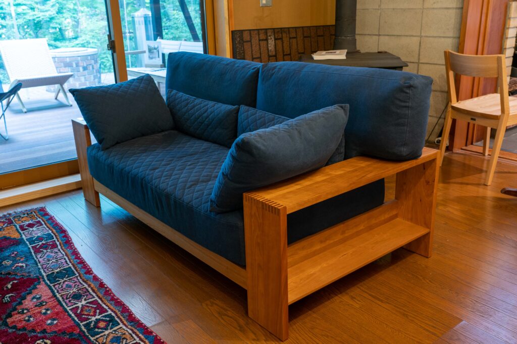 Kết hợp hài hòa giữa khối gỗ sồi tự nhiên và gam xanh navy trầm ấm, sofa tạo điểm nhấn sang trọng, phù hợp cho mọi không gian – từ căn hộ hiện đại đến homestay mang phong cách Nhật mộc.