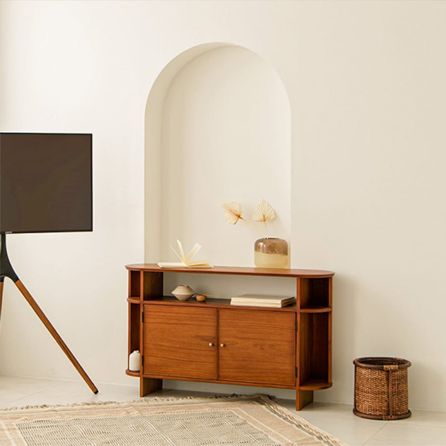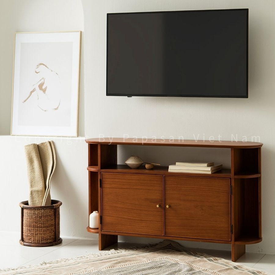 Điểm đắt giá nhất của TĐN61 nằm ở hai hệ kệ góc mở (Open Corner Shelves) được uốn cong mềm mại ở hai đầu tủ.