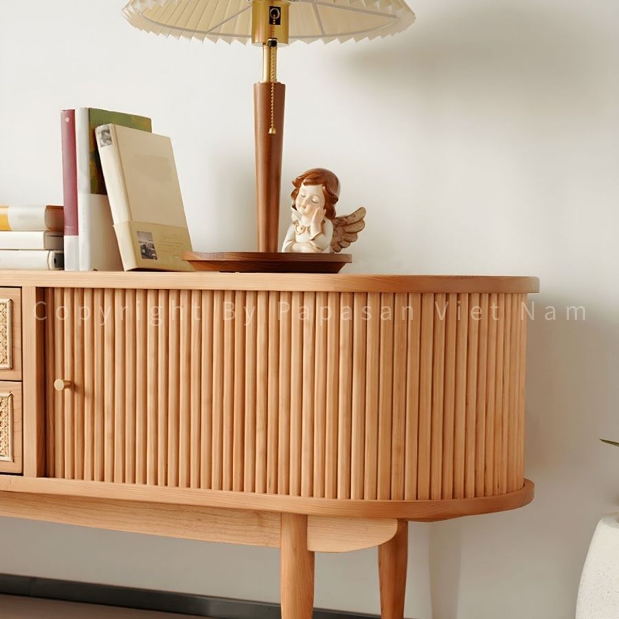 - Kết cấu bề mặt: Toàn bộ cánh cửa được phủ lớp gỗ nan dọc (Fluting); tạo nên một kết cấu bề mặt có chiều sâu và cảm giác chạm độc đáo; khác biệt hoàn toàn với những cánh tủ phẳng đơn điệu.
